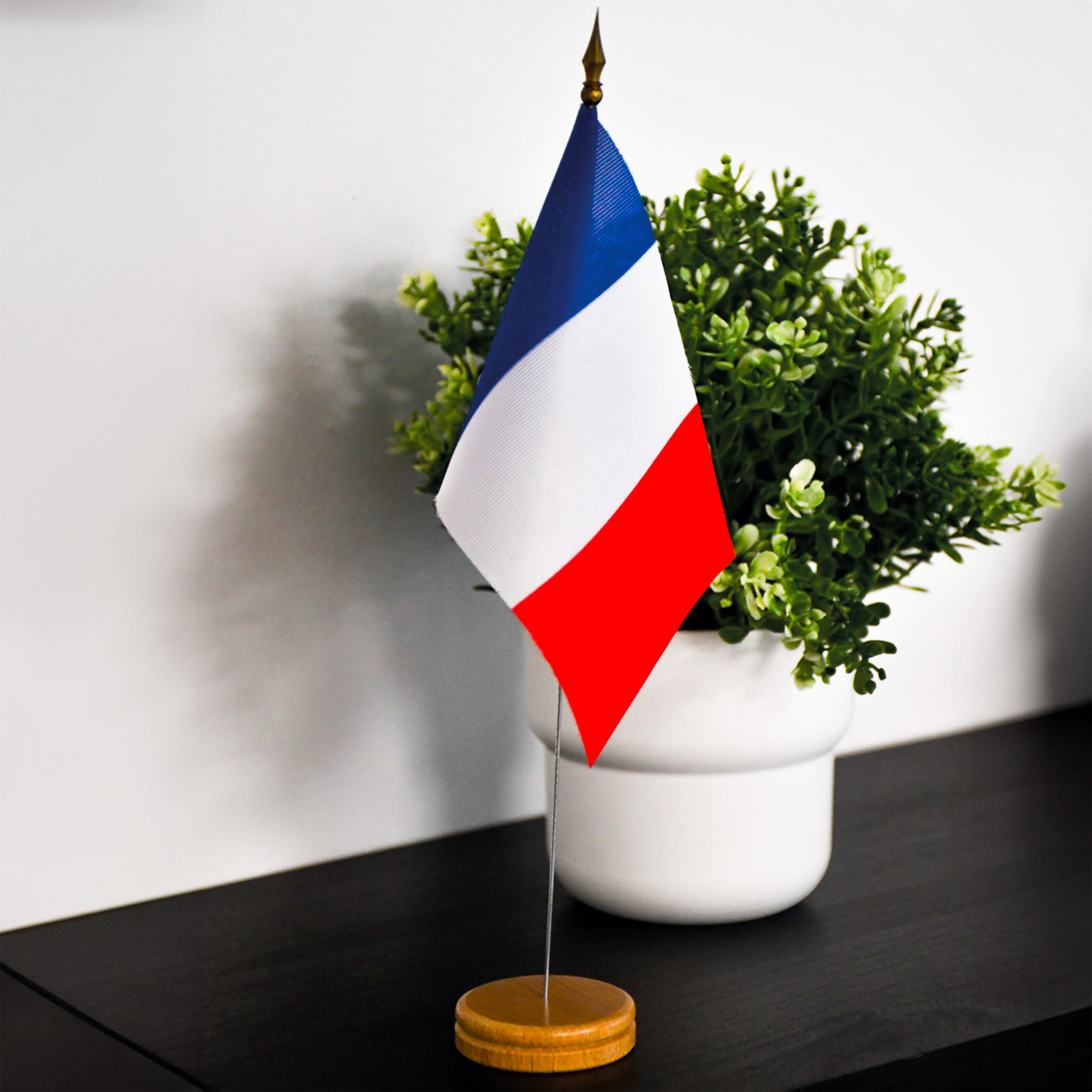 Drapeau français sur socle, parfait pour décorer votre table lors de célébrations ou événements patriotiques. Un accessoire stylé pour afficher votre fierté nationale.