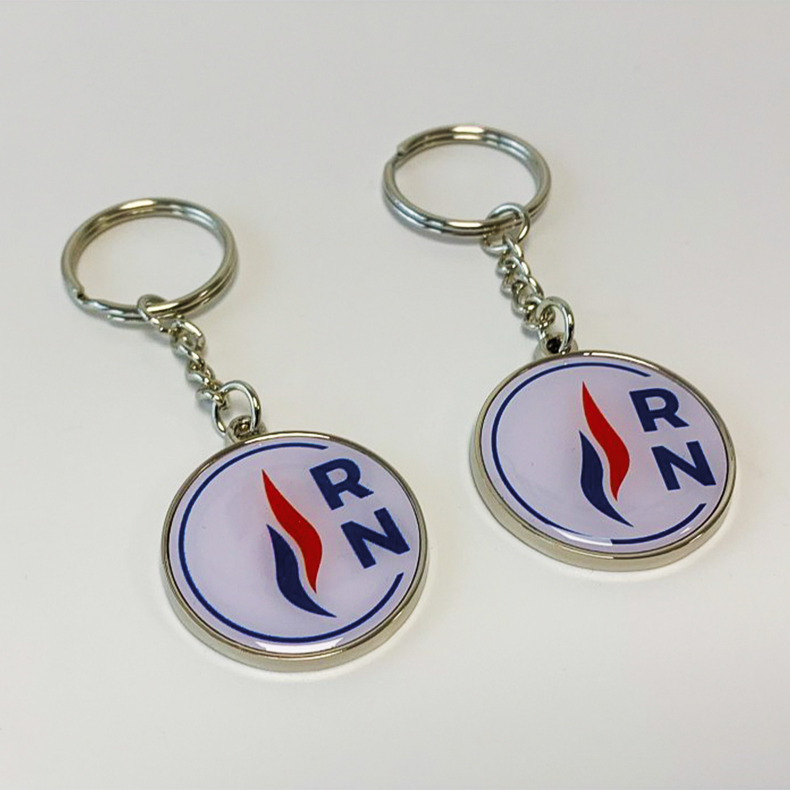 Porte-clés rond en métal de 3,5 cm avec finition nickel brillant, épaisseur de 3 mm et visuel RN vous vernit époxy pour durabilité.