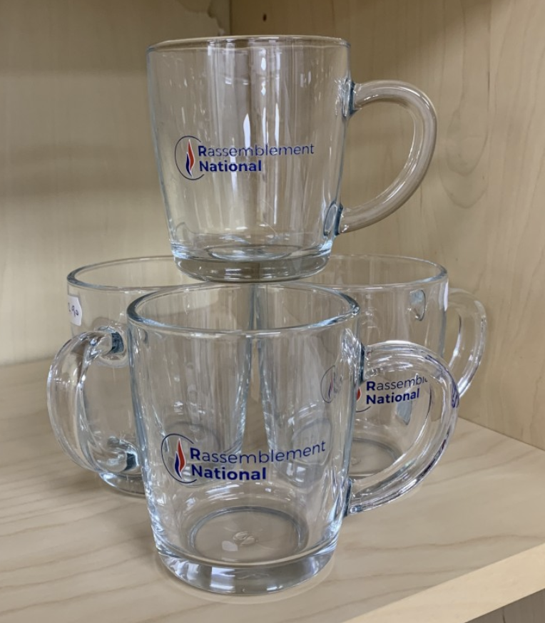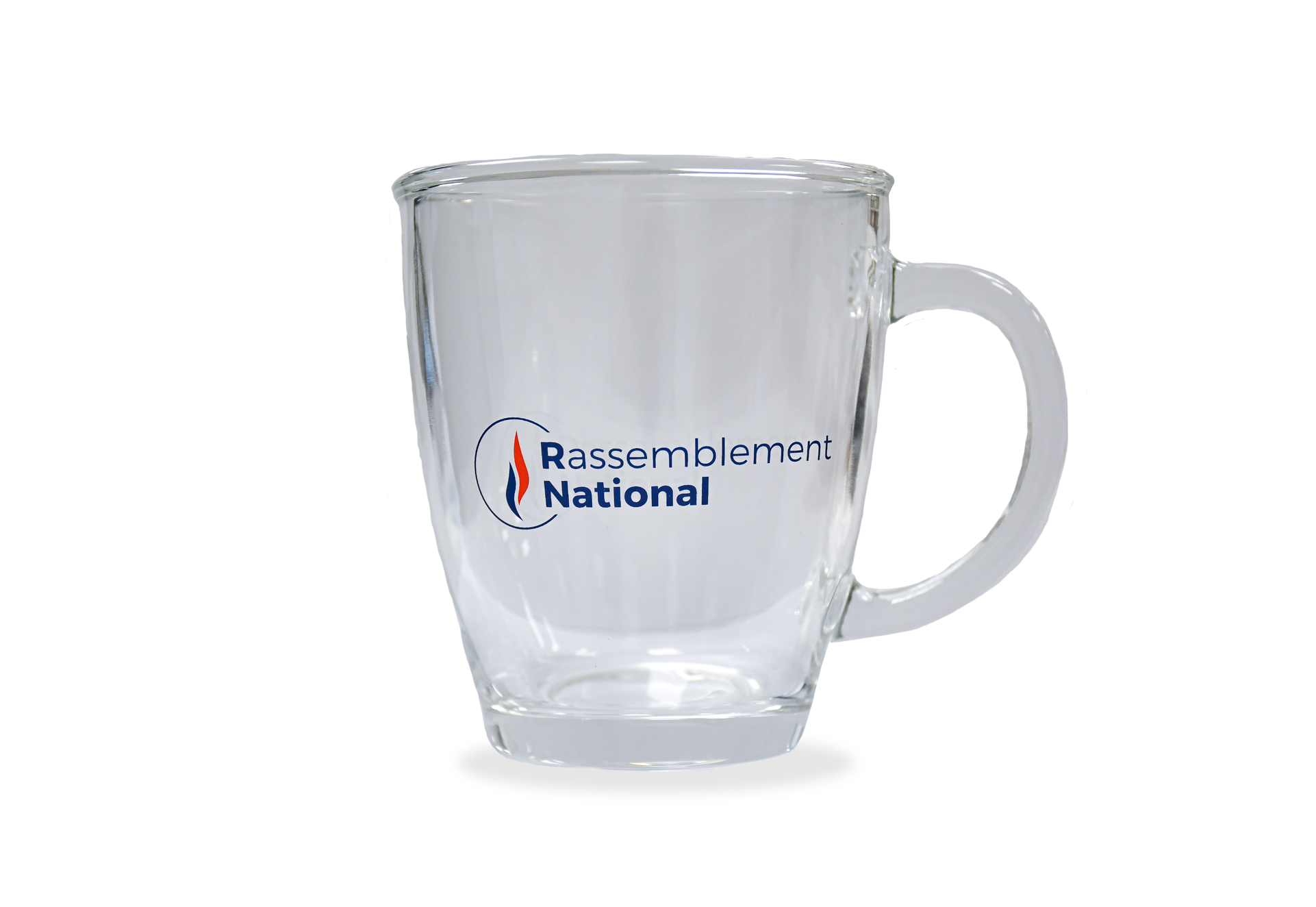 Tasse en verre de 350 ml sérigraphiée « Rassemblement National », fabriquée en France. Élégante et pratique, elle est parfaite pour savourer café, thé ou autres boissons.
